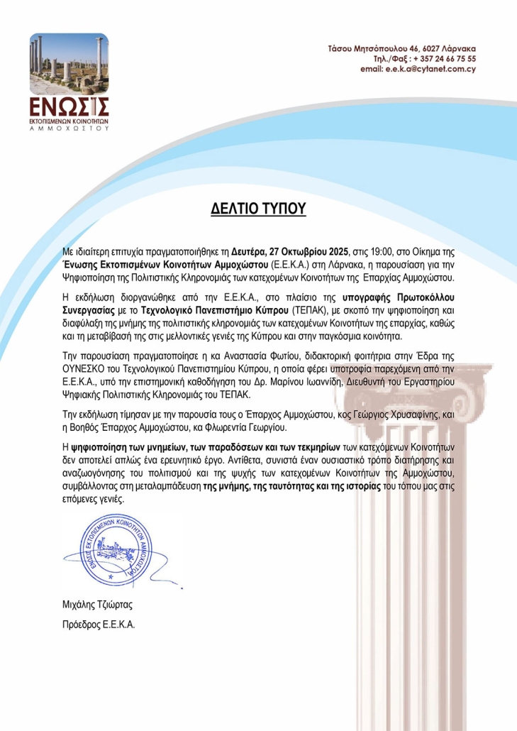 You are here: ΑΝΑΚΟΙΝΩΣΕΙΣ - ΔΡΑΣΕΙΣ1 / ΔΕΛΤΙΟ ΤΥΠΟΥ – Παρουσίαση για την Ψηφιοποίηση της Πολιτιστικής Κληρονομιάς των κατεχομένων Κοινοτήτων της Επαρχίας Αμμοχώστου.2 / ΔΕΛΤΙΟ ΤΥΠΟΥ – Παρουσίαση για την Ψηφιοποίηση της Πολιτιστικής Κληρονομιάς των κατε...